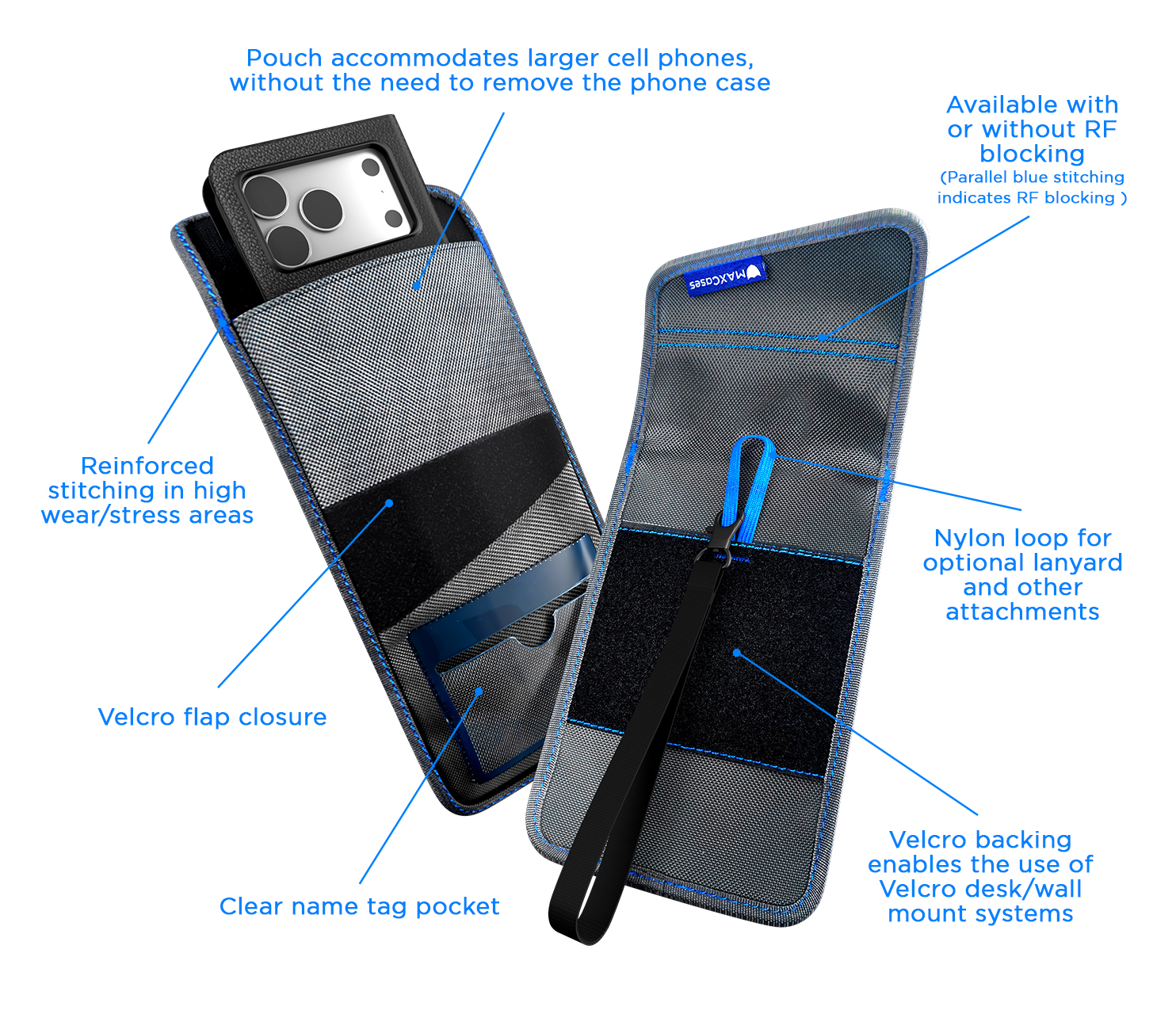 Get freedom from cellphone and Smart watch distractions with the MAXCases ShieldBloc Phone Pouch. Developed to address the concerns of K12 classrooms, this universal-fit pouch blocks wireless signals including Wi-Fi, Bluetooth, cellular, and more, for interruption-free learning. Durable dual-Velcro closures keep devices secure while audibly alerting teachers when a case is opened. Compatible with a variety of storage options, the back of the pouch features a large Velcro strip and woven loop for easy hanging options, while the front includes a clear ID pocket enabling the use of custom identification systems. Wrist lanyard not included; available as a separate purchase.